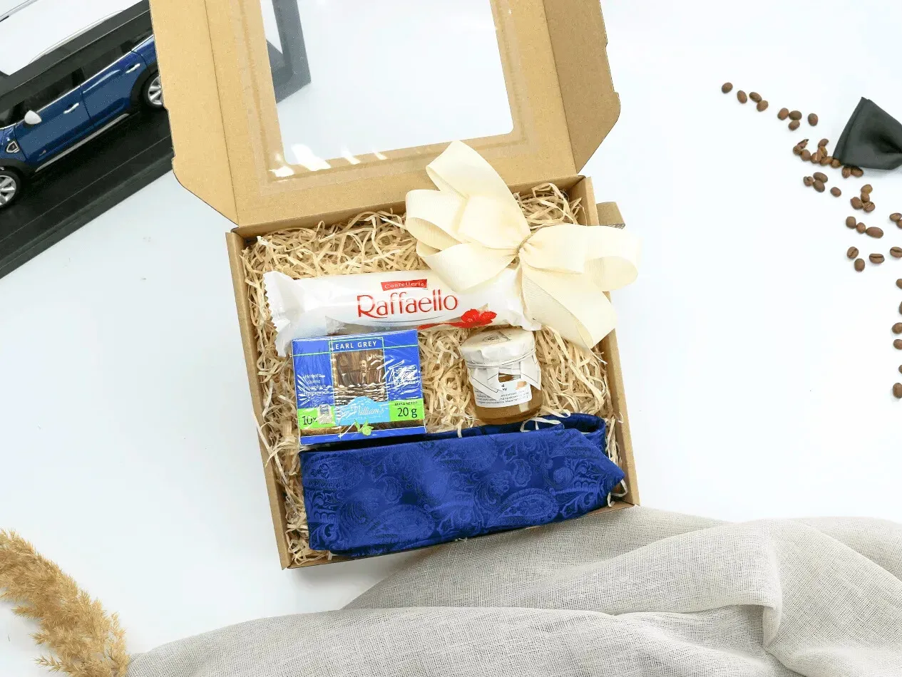 Zestaw Prezentowy „Krawatovo” – eleganckie połączenie klasycznych smaków i stylu. Herbata Earl Grey, mini miód lipowy, Raffaello i stylowy krawat w ozdobnym pudełku. Idealny prezent np. na Dzień Chłopaka!