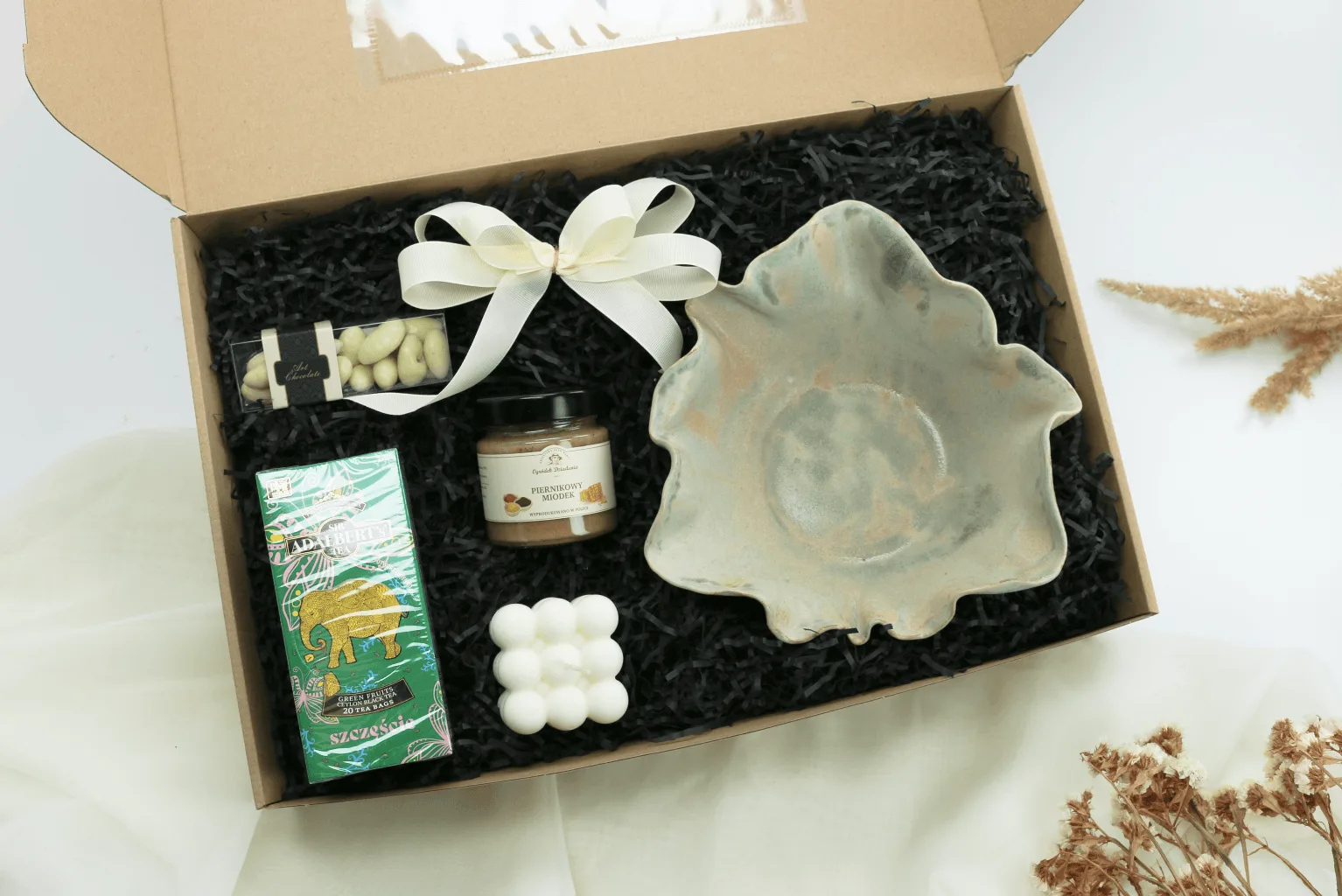Całość zapakowana jest w duże pudełko z okienkiem z czarnym wypełnieniem, co nadaje prezentowi naturalny i elegancki charakter. Dzięki temu zestaw nie wymaga dodatkowego pakowania – od razu nadaje się do wręczenia.