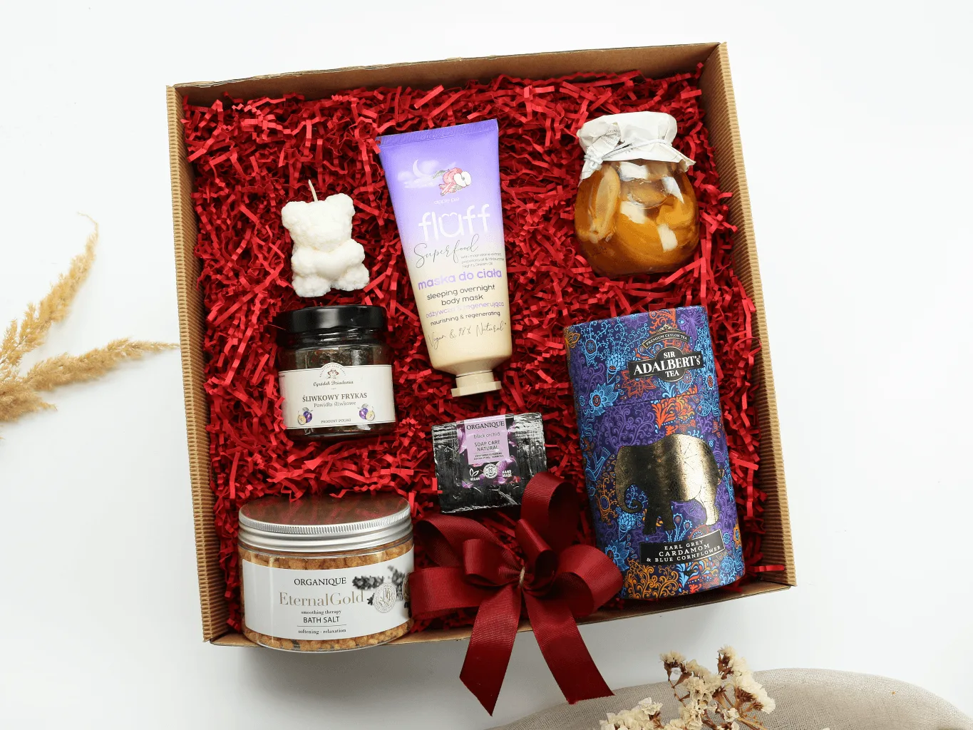 Zestaw zapakowany jest w duże beżowe pudełko, wyłożone czerwonym wypełnieniem, co dodaje całości elegancji i wyjątkowego charakteru. Całość zdobi wstążka z kokardką, co sprawia, że zestaw jest gotowy do wręczenia jako piękny prezent.
